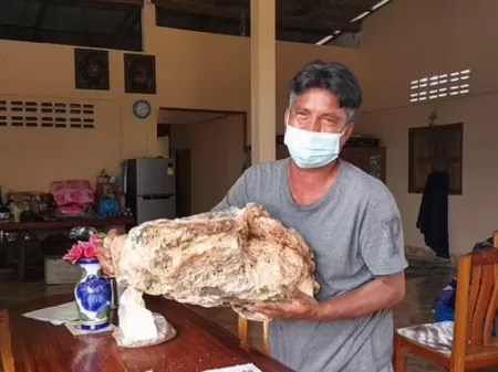 Um tailandês teve uma pescaria para lá de sortuda e que promete mudar sua vida para sempre. E não foi um peixe valioso que ele pegou, mas um pedaço de “vômito de baleia”, de cerca de 30 kg, que pode valer até 1 milhão de libras, o equivalente a R$ 7 milhões…