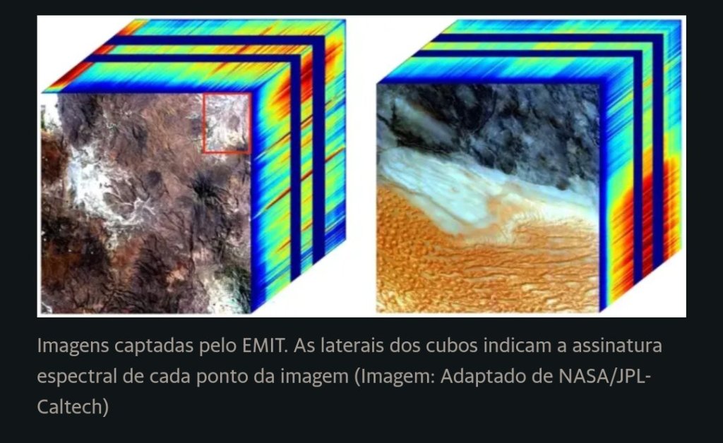 O EMIT funciona como um espectrômetro: um sensor que identifica diferentes comprimentos de onda da luz refletida por um objeto. Cada material absorve e reflete a luz de uma maneira diferente, possuindo sua própria “assinatura espectral”, como a impressão digital única de cada pessoa. O instrumento da NASA é capaz de identificar, dessa forma, quais são os minerais sendo carregados pelo vento na atmosfera terrestre