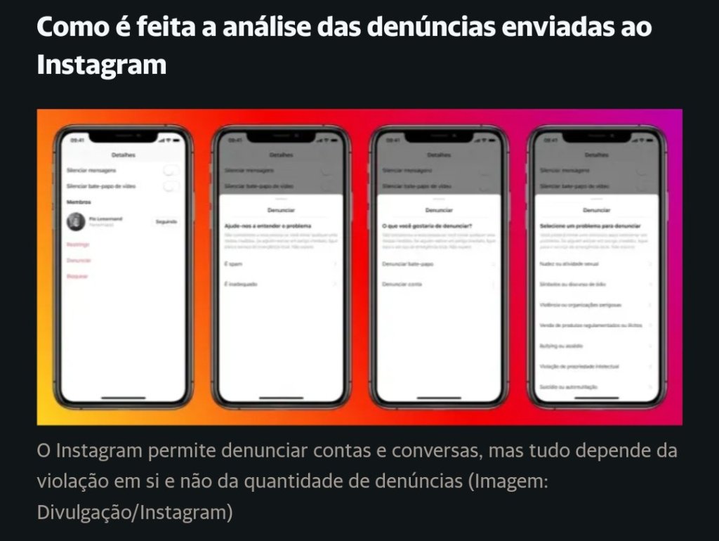 O Canaltech entrou em contato com a representação oficial do Instagram no Brasil para tentar entender como ocorre a análise das denúncias. A resposta veio como um artigo publicado no blog do Facebook em 2020 de autoria do Diretor de Gestão de Produto de Integridade, Jeff King, e da Diretora de Operações Globais, Kate Gotimer.